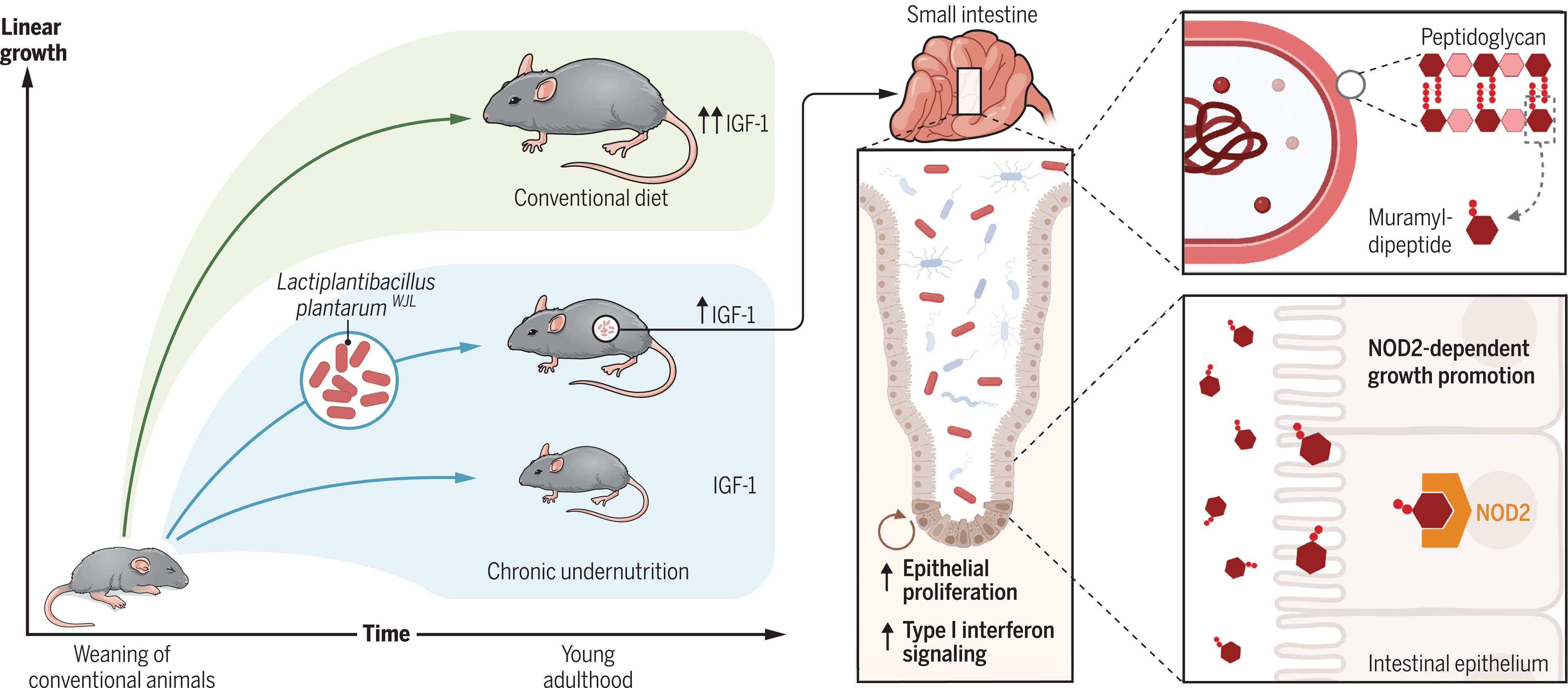 Microbe-mediated intestinal NOD2 stimulation improves linear growth of undernourished infant mice. Science