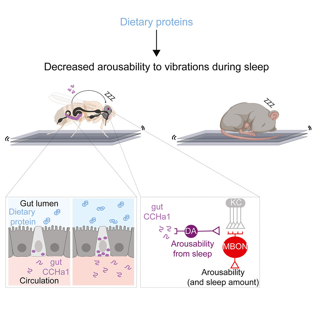 - 我们表明,当饮食富含蛋白质时,睡眠果蝇和小鼠对机械振动的反应得到更好的抑制。在果蝇中,我们描述了一种信号通路,通过该通路,有关摄入蛋白质的信息从肠道传递到大脑,以帮助抑制唤醒能力。