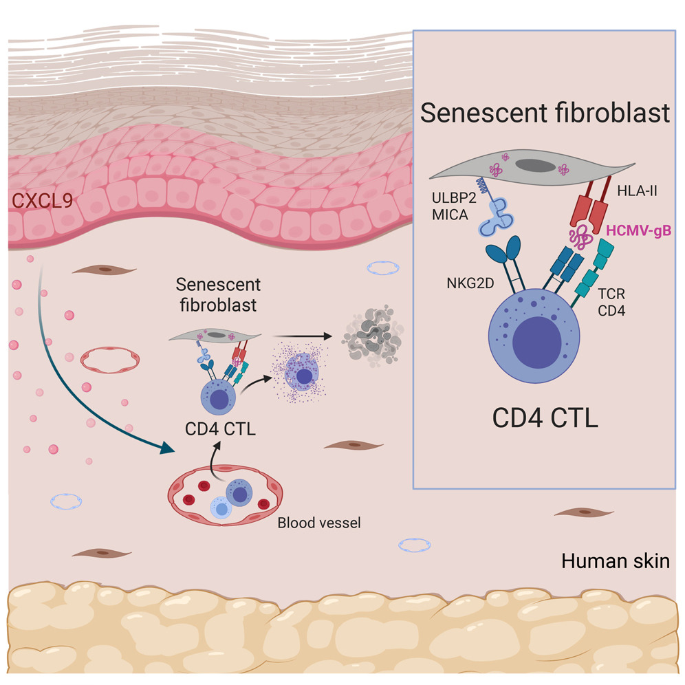 • 增加的 CXCL9 和细胞毒性 CD4+ T 细胞 (CD4 CTL) 募集与旧皮肤中衰老成纤维细胞减少显着相关。机制上,衰老成纤维细胞表达人类白细胞抗原 II 类 (HLA-II) 和人类巨细胞病毒糖蛋白 B (HCMV-gB),成为直接的 CD4 CTL 目标。皮肤驻留 CD4 CTL 以 HLA-II 依赖性方式消除 HCMV-gB+ 衰老成纤维细胞,而 HCMV-gB 激活人体皮肤的 CD4 CTL。